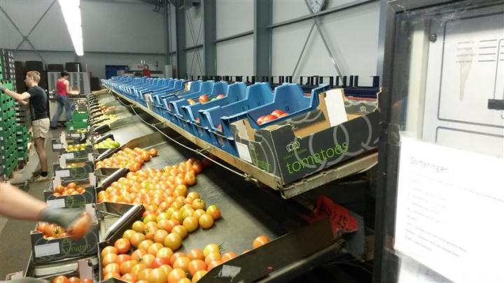 Nadat de tomaten gesorteerd zijn en in de bakken gelegd worden, moeten deze nog verpakt worden, voor ze naar de REO veiling kunnen vertrekken.