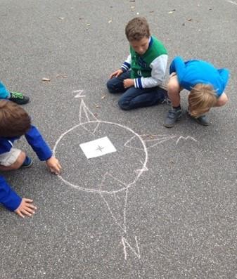 Met stoepkrijt of met een stok in het zand tekenen we een eenvoudige windroos (met de hoofdwindstreken).