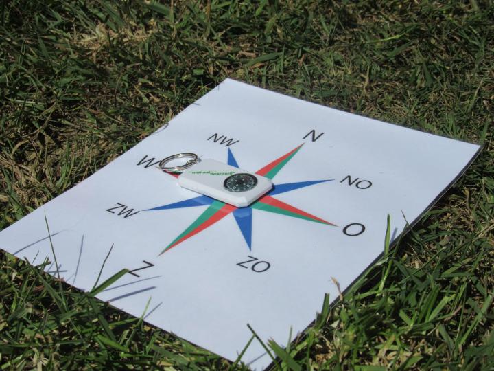 Leg het kompas plat, zodat het niet meer beweegt. Het gekleurde gedeelte van de naald wijst het noorden aan. Draai de roos zodat de N net boven het gekleurde deel van de naald komt te staan.